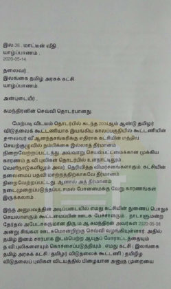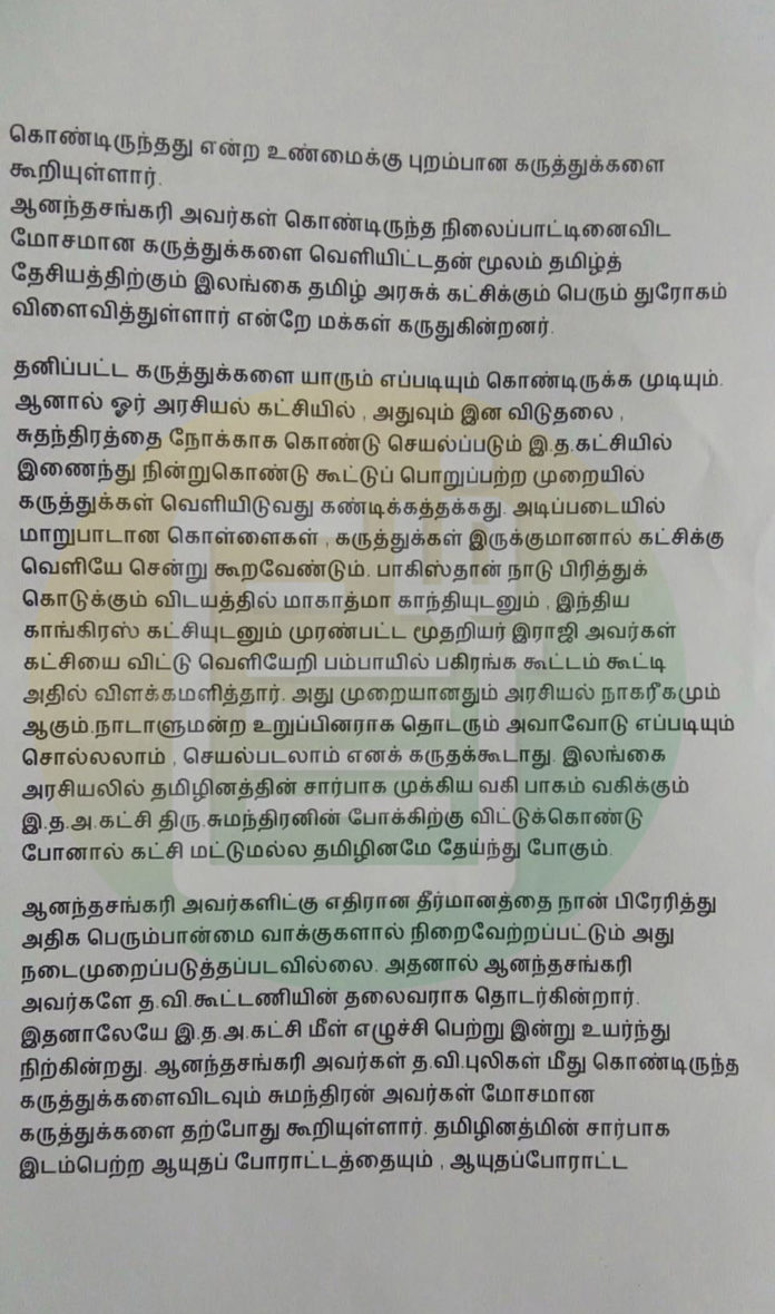 ஆனந்தசங்கரி அவர்களுக்கு எதிரான தீர்மானத்தை நான் பிரேரித்து அதிகப் பெரும்பான்மை வாக்குகளால் நிறைவேற்றப்படும் அது நடைமுறைப்படுத்தப்படவில்லை. அதனால் ஆனந்தசங்கரி அவர்களே த வி கூட்டணியின் தலைவராக தொடர்கிறார். இதனாலேயே இ த அ கட்சி முழு எழுச்சி பெற்று இன்றும் உயர்ந்து நிற்கின்றது. ஆனந்தசங்கரி அவர்கள் தவி புலிகள்மீது கொண்டிருந்த கருத்துக்களை விடவும் சுமந்திரன் அவர்கள் மோசமான கருத்துக்களை தற்போது தற்போது கூறியுள்ளார். தமிழினத்தின் சார்பாக இடம்பெற்ற ஆயுதப் போராட்டத்தையும், ஆயுதப்போராட்ட காலப்பகுதியில் தமது கட்சி நடந்து கொண்ட அணுகுமுறை பற்றியும் கொச்சைப்படுத்தி உள்ளார். இவற்றைக் கருத்தில் கொண்டு சுமந்திரன் மீது ஒழுங்கு நடவடிக்கை எடுக்க வேண்டும் என்று கேட்டுக்கொள்கிறேன்.