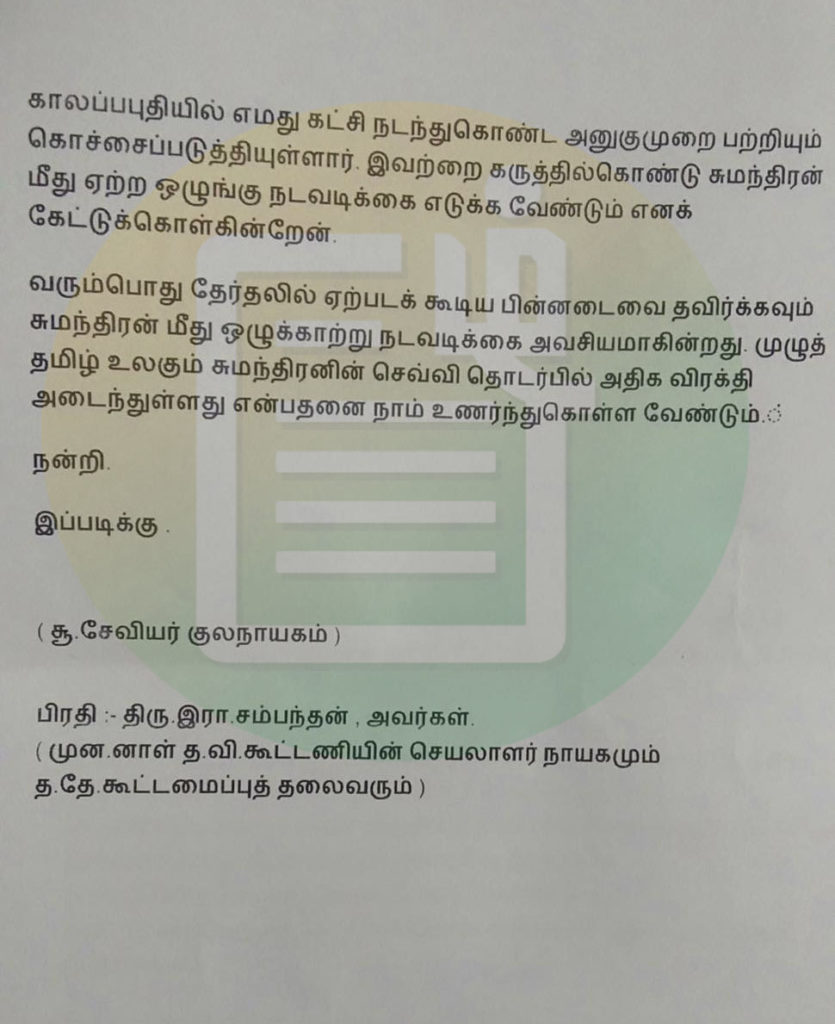 எம்.ஏ.சுமந்திரனுக்கு எதிராக ஒழுக்காற்று நடவடிக்கை எடுக்கும்படி தமிழ் தேசிய கூட்டமைப்பின் தலைவர் இரா.சம்பந்தன், தமிழ் அரசு கட்சியின் தலைவர் மாவை சேனாதிராசா ஆகியோருக்கு அவசர கடிதம் அனுப்பியுள்ளார், தமிழ் அரசு கட்சியின் நிர்வாக செயலாளர் சூ.சேவியர் குலநாயகம்.