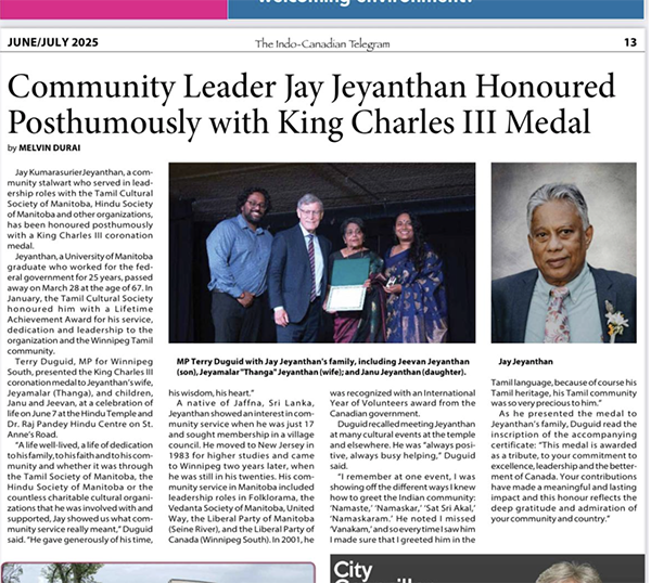 TORONTO, CANADA — October 24, 2025 — The Tamil community proudly announces that Kumarasuriyer “Jay” Jeyanthan (1958–2025) has been awarded the King Charles III Coronation Medal (Canada), a national honour presented in recognition of outstanding service and dedication to community and country.