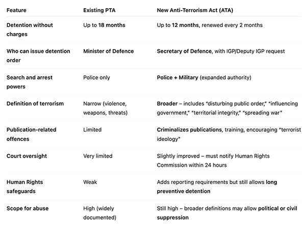 முன்மொழியப்பட்ட ATA தடுப்புக் காவலை PTA இன் கீழ் 18 மாதங்களிலிருந்து 12 மாதங்களாக குறைக்கிறது, ஆனால் நீண்ட காலத்திற்கு முறையான குற்றச்சாட்டுகள் இல்லாமல் தனிநபர்களை வைத்திருக்கும் திறனைப் பராமரிக்கிறது. புதிய மசோதாவின் கீழ், பாதுகாப்புச் செயலாளர் IGP அல்லது துணை IGP இன் பரிந்துரையின் பேரில் புதுப்பிக்கத்தக்க இரண்டு மாத தடுப்பு உத்தரவுகளை பிறப்பிக்கலாம்.