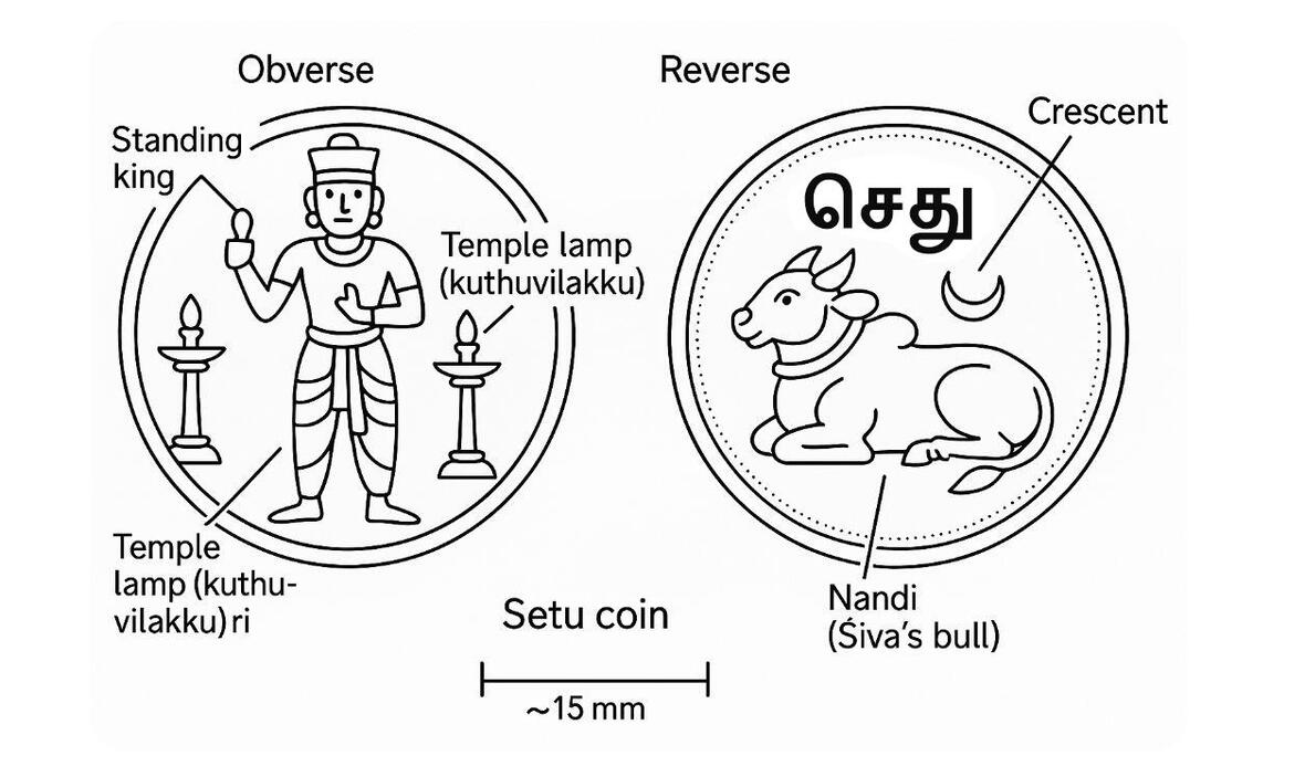 The coins, sometimes called “Setu bulls,” carry a standing ruler flanked by temple lamps on the obverse and a couchant Nandi (Śiva’s bull) with a crescent and the Tamil legend “செது / SETU” on the reverse. In pre-modern South Asia, the right to strike coinage bearing one’s own language, symbols, and titulature is a classic marker of de-facto sovereignty.