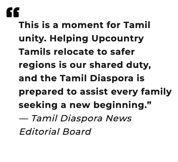 The Diaspora is calling upon Tamil organizations, temple trustees, community associations, and global supporters to collaborate in ensuring a dignified, efficient, and compassionate resettlement process for Upcountry Tamils (Malaiyaha Tamils) seeking safety and stability.